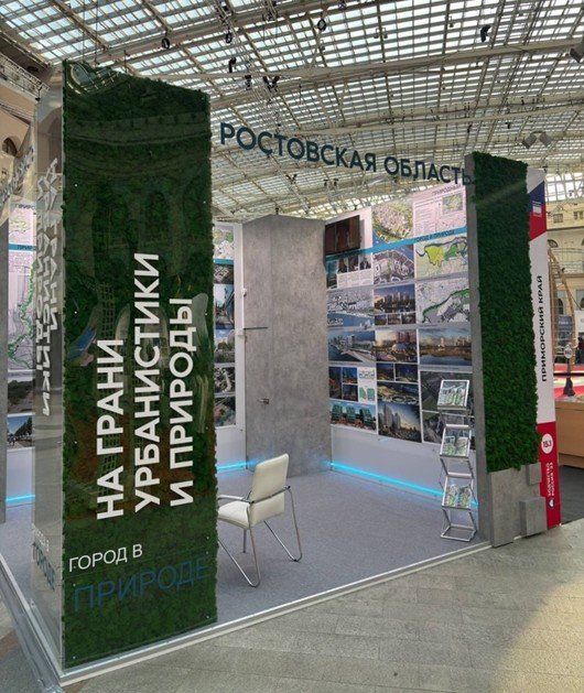 в рамках смотра-конкурса «Регионы России» в разделе «Реализация», в номинации «Развитие территорий и градостроительные решения». Концепция экспозиции построена на контрасте фактур и материалов: асимметричная композиция стенда в форме куба и многоуровневая компоновка планшетов символизируют динамичное развитие Ростовской области, где современные индустриальные решения органично сочетаются с природным разнообразием.